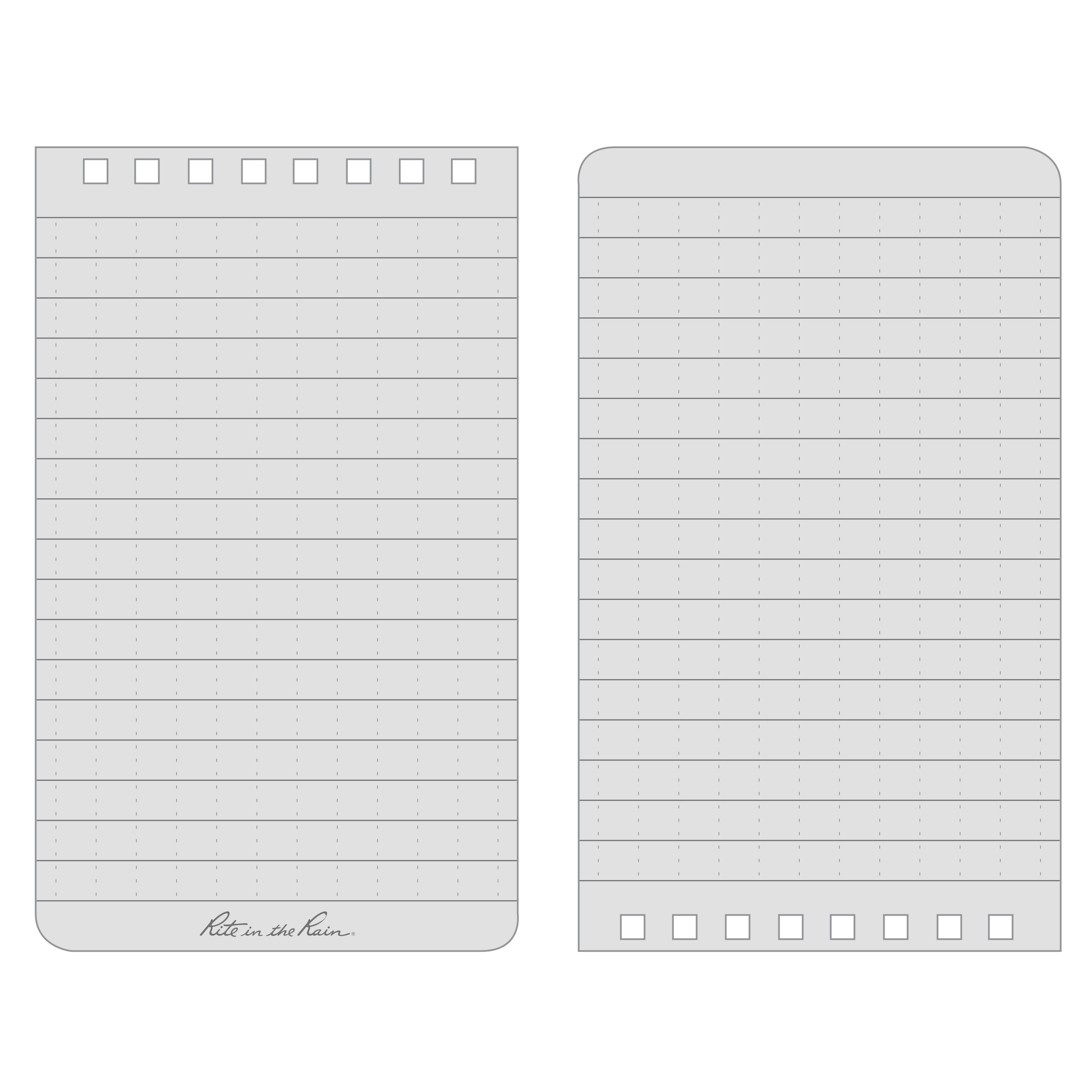 The Rite in the Rain Weatherproof 3" x 5" top spiral notebook with a black cover is small enough to fit comfortably in your pocket and tough enough to survive any of mother nature's onslaughts. This scrappy pocket notebook will survive rain, sweat, mud, snow, oil, and grease. The non-glare gray paper is legible in bright sunlight. The impact-resistant wire-o binding won't lose its shape. The Polydura cover defends your field notes from scratches and stains. Each notepad is printed with a standard and metric ruler on the back cover. Rite in the rain all-weather writing products have been made in Tacoma, WA, USA since 1916. Recycle rite in the rain paper with standard papers. Recycle the entire notebook using most curbside programs (paper, plastic, & metal). Simply separate the wire-o binding from the cover prior to recycling for easier processing.