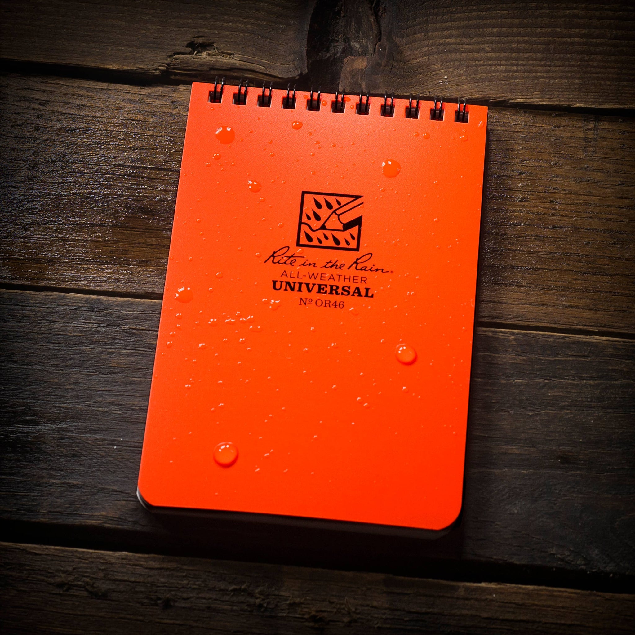 The Rite in the Rain 4" x 6" Weatherproof Orange Top-Spiral Notebook is small enough to fit comfortably in your pocket and tough enough to survive any of mother nature's onslaughts. This rugged pocket notebook will survive rain, sweat, mud, snow, oil, and grease. Impact resistant Wire-O binding won't lose its shape when tossed around in packs or put in a back pocket, and the Polydura cover defends your notes from scratches and stains. The entire notebook is recyclable using most curbside programs; simply separate the Wire-o binding from the cover prior to recycling for easier processing. Each notebook contains 100 pages/50 sheets. (No. OR46)